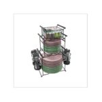 Stacks to free space with a vertical display or detaches as individual serving pieces. Side handles for easy transport. Made of carbon steel with classic black finish. Wipes clean with damp cloth. Holds square napkins 7″ x 7″ or smaller. Holds plates 8″ to 10.75″. Utensil Holders 5”D. Measures Approximately 18.50″ L x 10″ W x 21.75″ H (stacked).