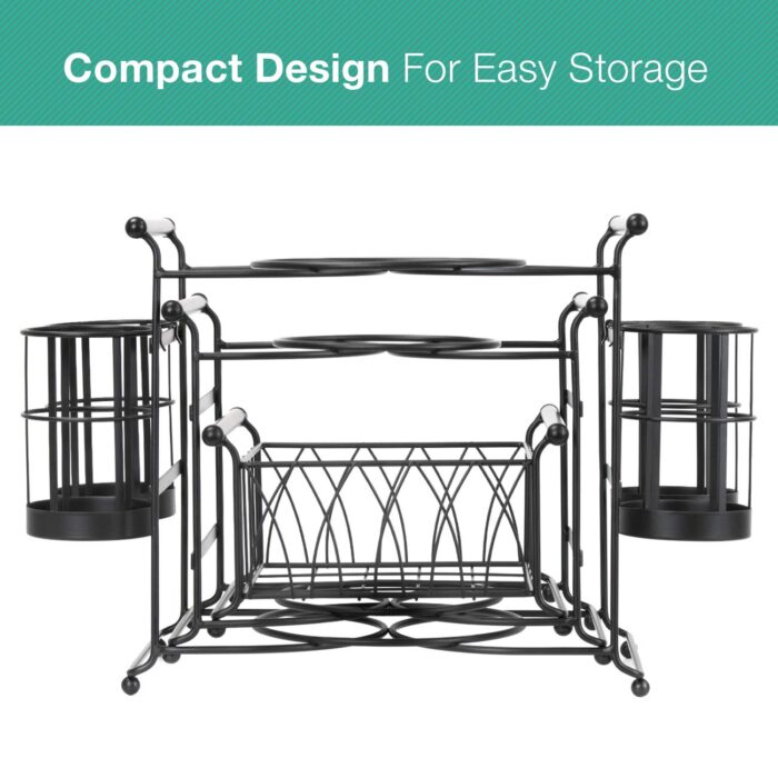 Stacks to free space with a vertical display or detaches as individual serving pieces. Side handles for easy transport. Made of carbon steel with classic black finish. Wipes clean with damp cloth. Holds square napkins 7″ x 7″ or smaller. Holds plates 8″ to 10.75″. Utensil Holders 5”D. Measures Approximately 18.50″ L x 10″ W x 21.75″ H (stacked).