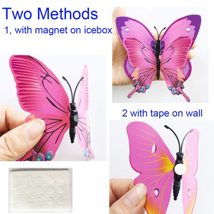Totally 36 pcs different models 3D butterflies, 4 colors and 2 styles to choose. 4 colors: Green, blue, red and yellow, 2 styles: single wing and double wing;