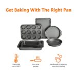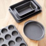 • 6-piece bakeware set includes a 9×5-inch loaf pan, 2 round 9-inch cake pans, a 12-cup muffin pan, a 13×9-inch roast pan, and a 13×9-inch baking sheet