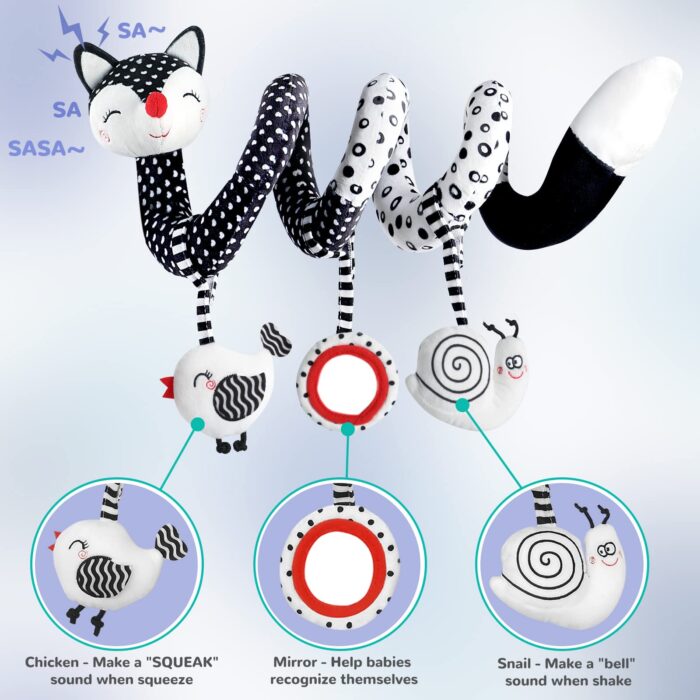 - 【Develop Baby Visual Ability】The visual development of a newborn baby needs a certain period of time. When the baby is 0-12 months old, the black and white series of spiral activity baby toys is the best choice for the baby’s vision development. Adorable newborn hanging rattle toys with animal design can inspire baby’s visual development and cultivating baby’s color perception, encourage baby to touch and explore