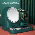 • The makeup storage box features a rotatable mirror that can be adjusted to your desired angle. The mirror can be easily rotated to provide a 360-degree view, and there’s a button to adjust the lighting to either sit or stand, depending on your preference. Additionally, there’s a fan unit that can enhance the absorption of your lotion, reduce waiting time, prevent sweating, and make your makeup application a more enjoyable experience. The device can be conveniently charged using a USB cable.