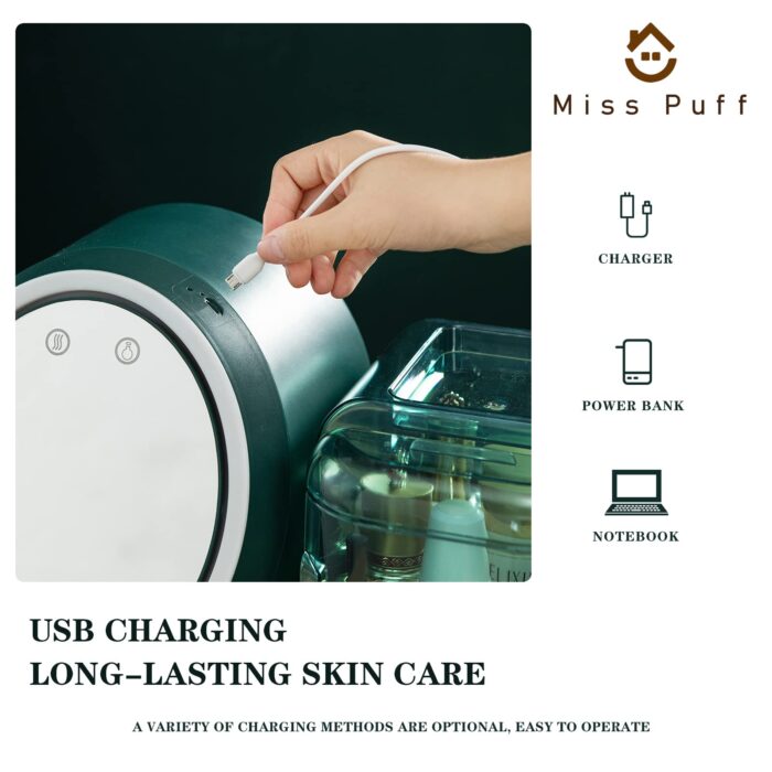 • The makeup storage box features a rotatable mirror that can be adjusted to your desired angle. The mirror can be easily rotated to provide a 360-degree view, and there’s a button to adjust the lighting to either sit or stand, depending on your preference. Additionally, there’s a fan unit that can enhance the absorption of your lotion, reduce waiting time, prevent sweating, and make your makeup application a more enjoyable experience. The device can be conveniently charged using a USB cable.